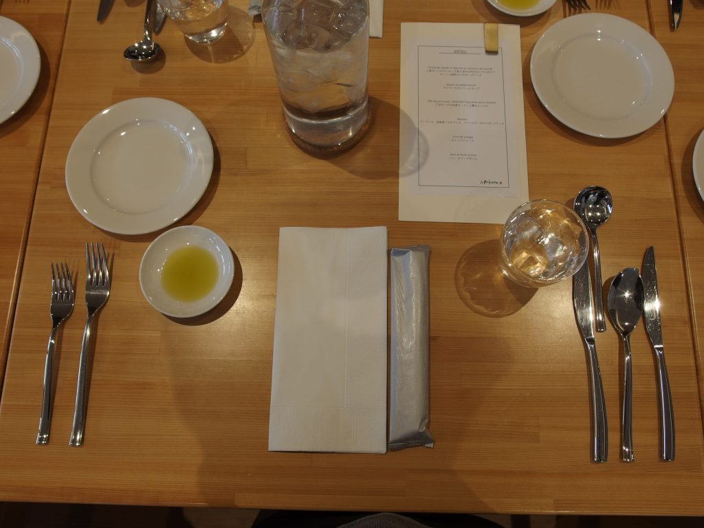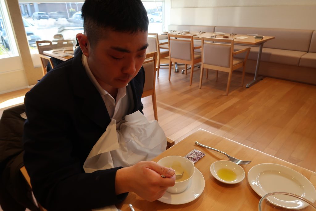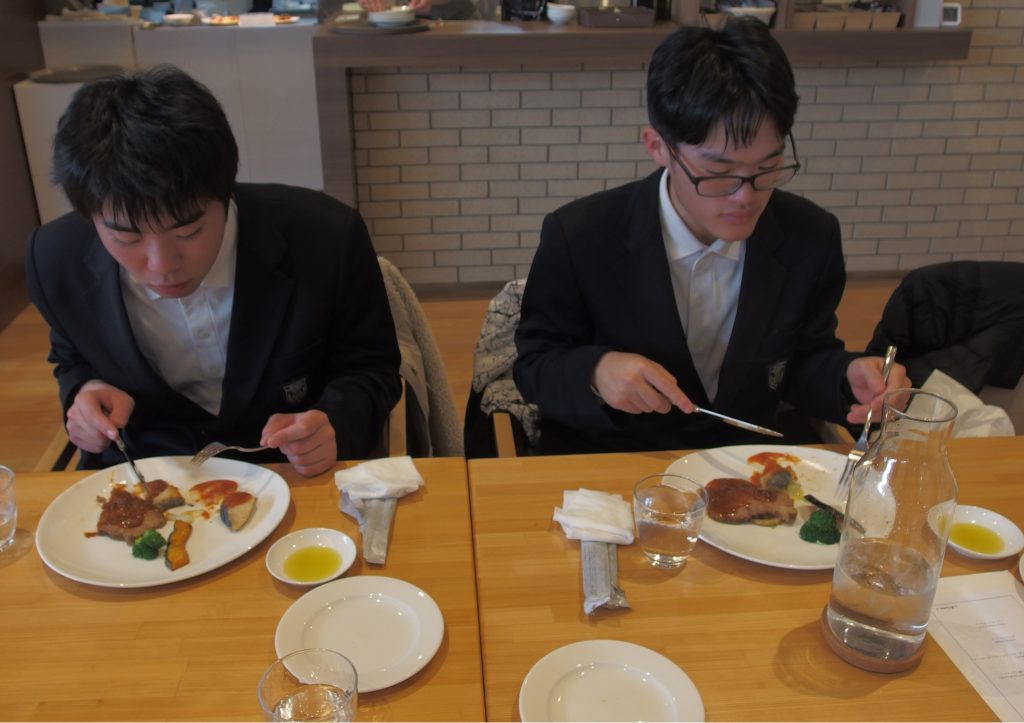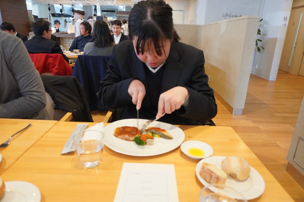 生活単元学習や家庭科等でテーブルマナーについて学習し、当日はシェフから簡単にテーブルマナーと料理の説明をしていただきました。事前学習と当日の説明を生かして、ナイフとフォークを使って上手に食事をすることができました。